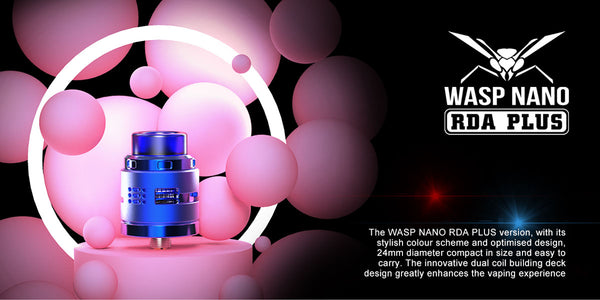 The WASP NANO RDA PLUS version . with its stylish colour scheme and optimised design 24mm diameter compact in size and easy to carry . The innovative dual coil building deck design greatly enhances the vaping experience.