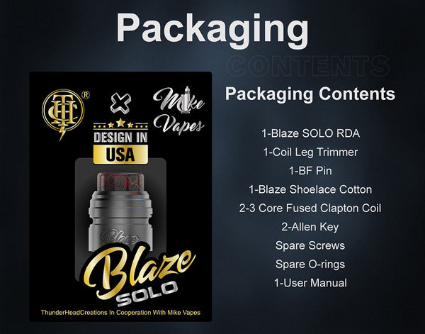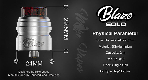 The authentic ThunderHead Creations X Mike Vapes Blaze Solo RDA is responding to the high demand and great feedback of Blaze RTA, here comes a single coil Blaze RDA designed...