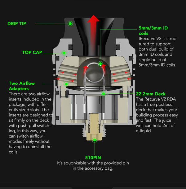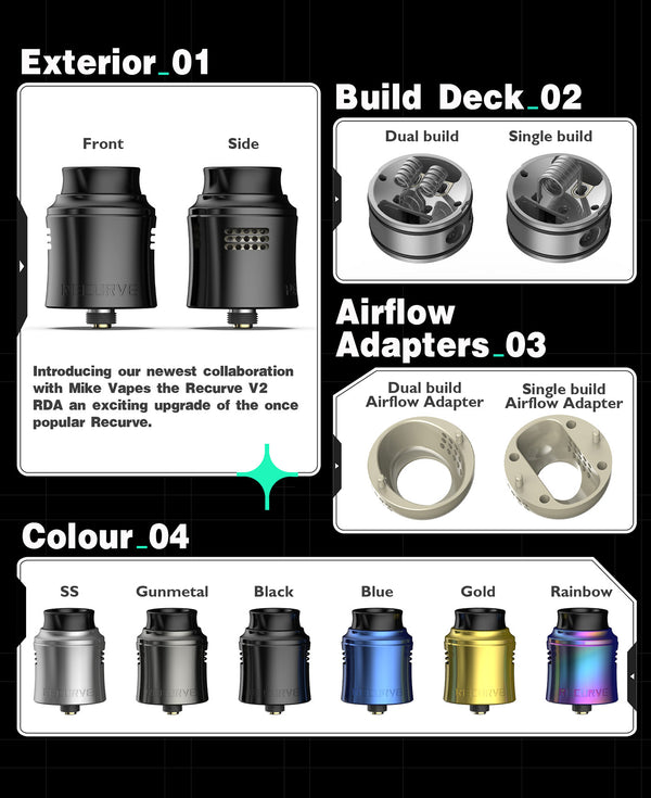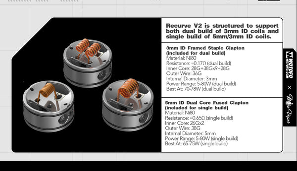 Introducing the Wotofo newest collaboration with Mike Vape--the Recurve V2 RDA an exciting upgrade of the once popular Recurve and has a diameter of 24.6mm, 35.55mm Height with the drip...