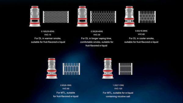 Coil Resistance: 0.3ohm(30-45W; VVC-30), 0.6ohm(18-26W; VVC-60), 0.9ohm(9-16W; VVC90), 0.15ohm(35-60W; VVC15),1.2ohm(7-13W; VVC120)