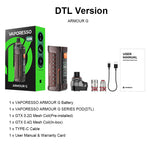 The Vaporesso ARMOUR G Pod Mod Kit Featuring patented Mega Batt technology,and boasts a 3000mAh battery that maintains a compact size while delivering 80W of power, making it more portable...