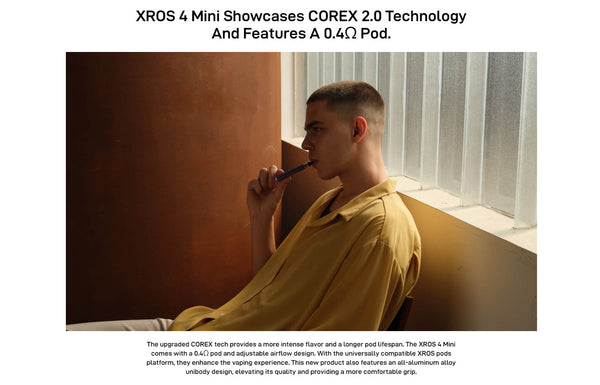 Vaporesso XROS 4 Mini Pod System is the upgraded version of XROS 4 with a larger juice capacity (3ml), a powerful 1000mAh battery, and an RGB battery life indicator light. XROS 4 Mini Pod System Kit is sleek and lightweight. Its pod cartridge is transparent so that you can check the e-juice level with ease. The battery indicator light uses three colors to show the battery life clearly. Vaporesso XROS 4 Mini is compatible with all the XROS series pod cartridges and you can switch between MTL and RDL vaping with precise airflow control. The pre-installed 0.4ohm Mesh Pod utilizes the COREX 2.0 Tech to bring you stronger flavors and long-time enjoyment.