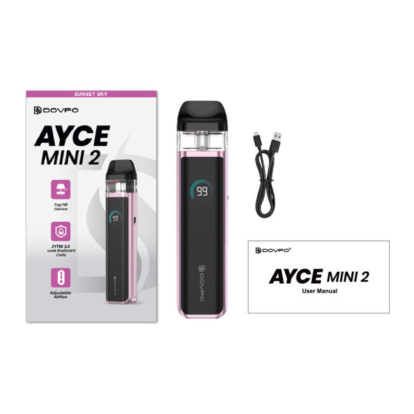 The Dovpo Ayce Mini 2 Pod System Kit delivers enhanced performance in a compact form, now powered by a 1000mAh battery and supporting up to 30W of output. Engineered with advanced ZYTEK 2.0 Technology and a Hydra-lock Microfibre system, it provides richer flavor, longer coil life, and superior leak resistance. Crafted from durable zinc alloy and borosilicate glass, the Ayce Mini 2 features a sleek design with a crystal-clear screen and a responsive digital display enhanced by a dynamic LED halo. This modern, portable pod system is ideal for MTL and RDL users looking for a refined vaping experience with elevated aesthetics and performance.