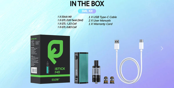 Eleaf iStick i40 Kit is companied by the monstrosity of its 2600mAh battery, which is rated for 1-40W output. Constructed from leather and metal, it combines both delicacy and compactness....