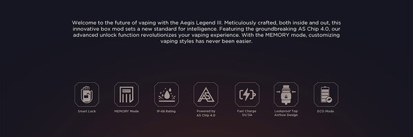 Welcome to the future of vaping with the Aegis Legend III. Meticulously crafted, both inside and out, this innovative box mod sets a new standard for intelligence. Featuring the groundbreaking AS Chip 4.0, our advanced unlock function revolutionizes your vaping experience. With the MEMORY mode, customizing vaping styles has never been easier.