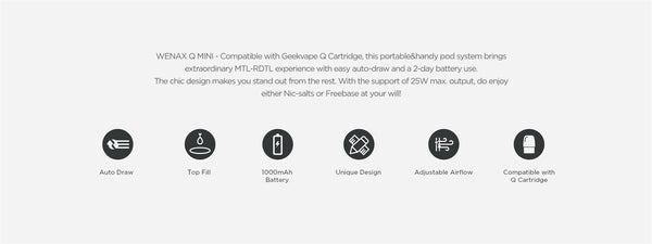 Wenax Q Mini - Compatible with Geekvape Q Cartridge, this portable & handy pod system brings extraordinary MTL-RDTL experience with easy auto-draw and a 2-day battery use. The chic design makes you stand out from the rest. With the support of 25W max. output, do enjoy either Nic-salts or Freebase at your will!