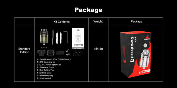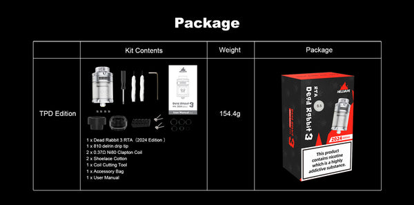 HELLVAPE Dead Rabbit V3 25mm RTA 2024 Edition retains the excellent features of HELLVAPE Dead Rabbit V3 and has been further upgraded.featuring a 5.5mL glass capacity, post-less build deck, and dual slotted top to bottom airflow control. Constructed from durable stainless steel, the tank chassis utilizes superior materials in its creation, allowing for protection against light falls and drops.