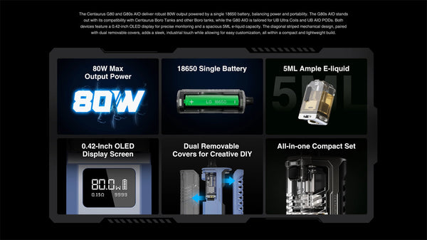 the Lost Vape Centaurus G80 AIO Pod Mod Kit, which features a 5-80W output range, a durable zinc and aluminum chassis, and a 5ml capacity in the Centaurus Boro Tank....