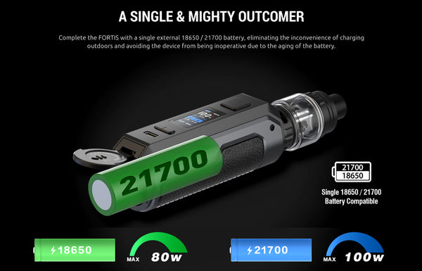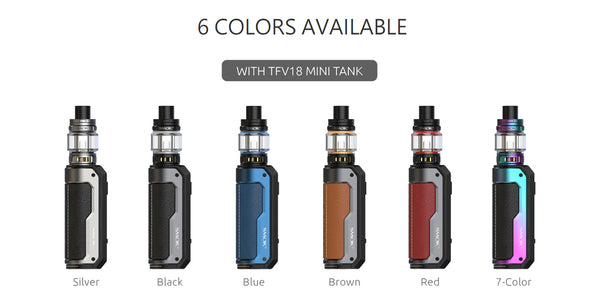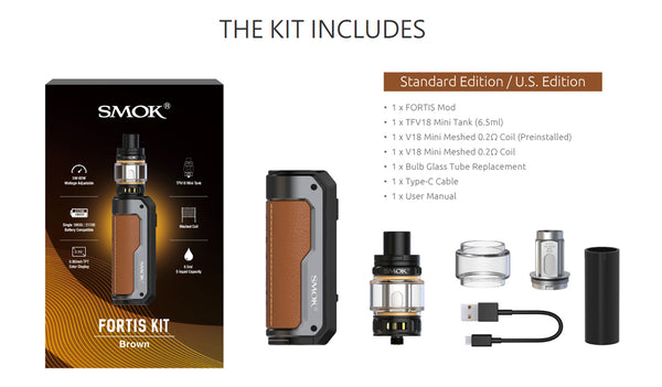 The Smok Fortis Kit, evolving from the tried-and-tested Thallo 8 Thallo S Kit and upgrading them with a 510 thread TFV18 Mini tank, the elegant leather on the top of his body, the ergonomic design makes it easy to grip and non-slip. Powered By a single external 18650 / 21700 battery then serves your vaping with adjustable power up to 80w. Built-in smart chipset, features 0.001s instant firing speed, straightforward operation data on the 0.96inch TFT color screen, with operation buttons, you can adjust the wattage and function or more. The 6.5ml TFV18 Mini Tank comes with two mesh coils(one pre-installed), with an adjustable bottom airflow control valve, TFV18 Mini Tank will definitely bring an all-new vaping experience! The top filling system is easy to use and effectively leak-proof.