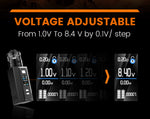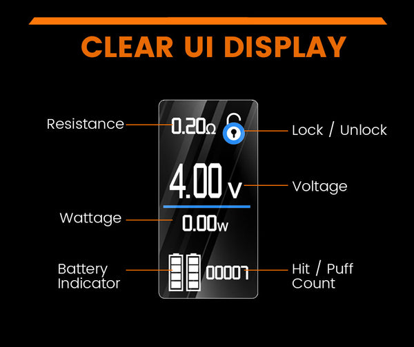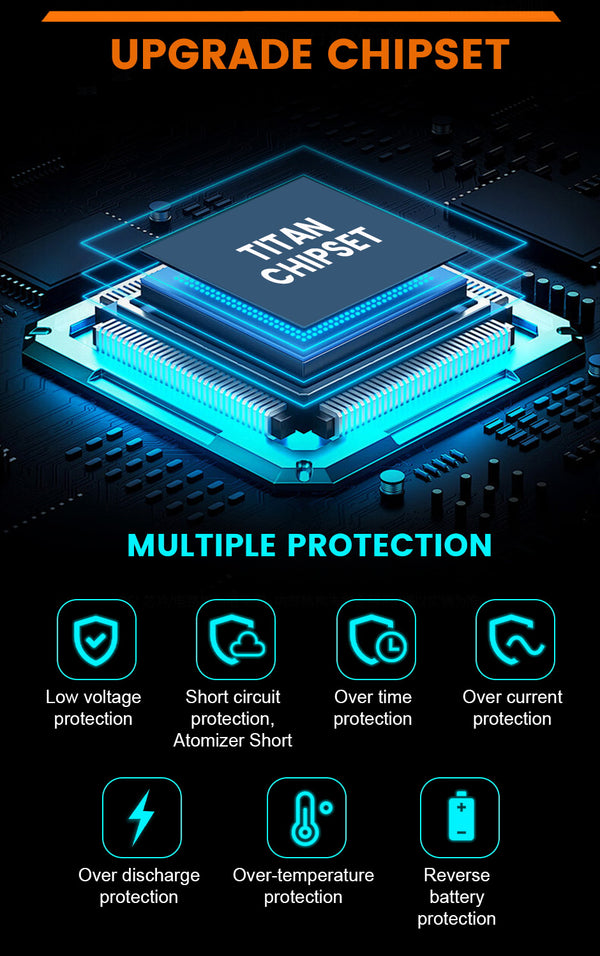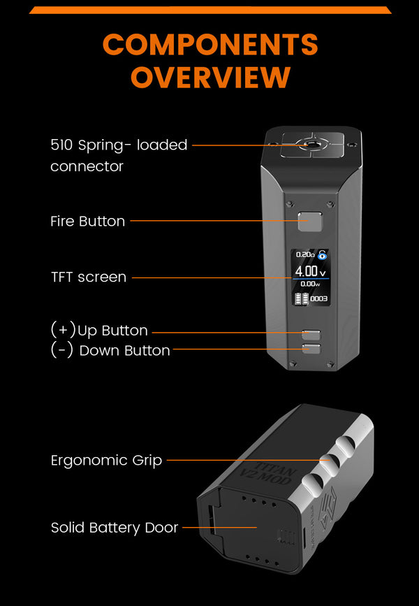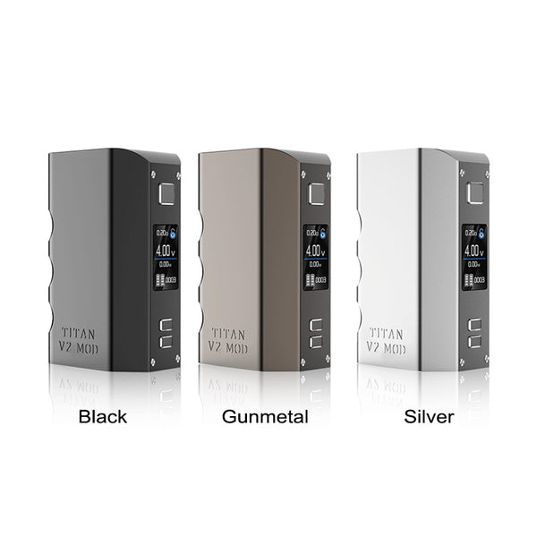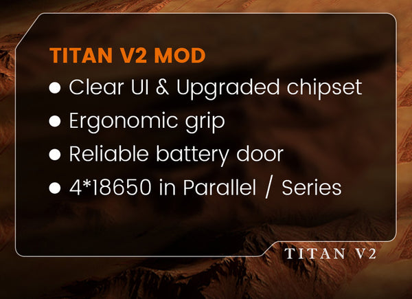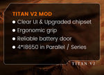 The TITAN V2 Mod is powered by four 18650 batteries (not included), delivering up to 300W of output with adjustable voltage, a robust aluminum-alloy chassis, and an intuitive LCD TFT display.