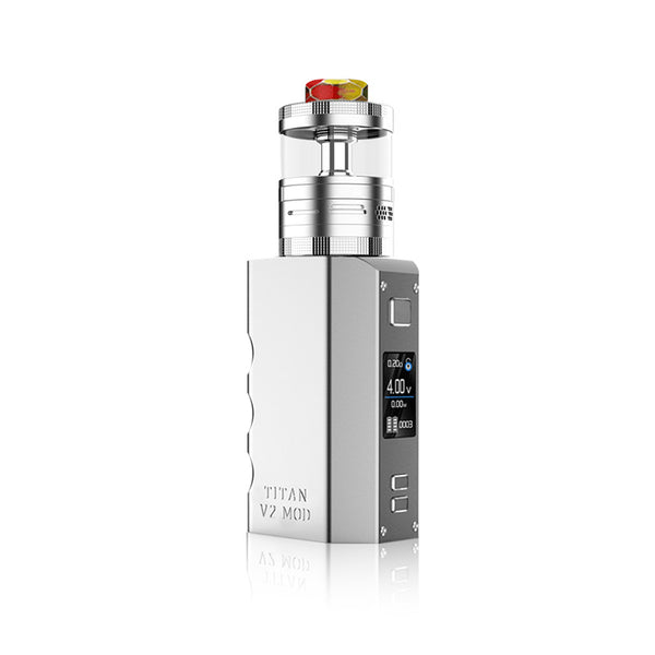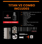 Unleash unparalleled power with the Steam Crave TITAN V2 Combo Kit, a premium vaping setup designed for enthusiasts who demand high performance and versatility. The TITAN V2 300W Box Mod is powered by four 18650 batteries (not included), delivering up to 300W of output with adjustable voltage, a robust aluminum-alloy chassis, and an intuitive LCD TFT display. Paired with the Aromamizer Titan V2 RDTA, this combo offers unmatched flexibility with a massive 32mL tank capacity, adjustable juice and airflow controls, and a postless build deck supporting dual coils in series or parallel configurations. This kit comes with essential accessories, including a dual mesh build deck, spare glass, and more, making it the ultimate choice for advanced vapers.