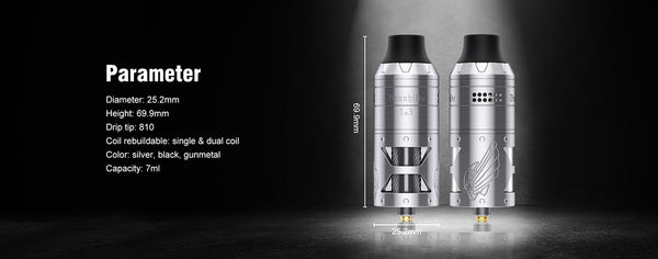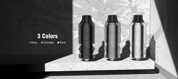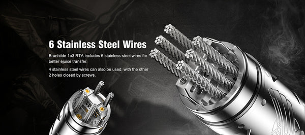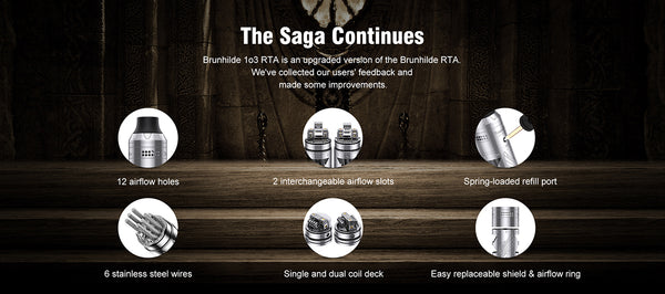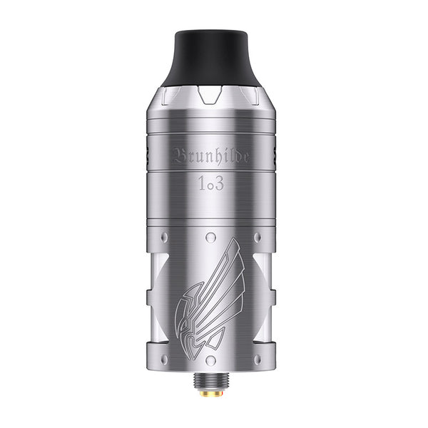 Vapefly Brunhilde 1o3 RTA is the upgraded version of Brunhilde RTA. When the bottom airflow is closed, the airflow will still go directly to the center of the coils with the design of 12 airflow holes. In addition, there are 2 interchangeable airflow slots to give users more airflow options. The 360 degree surrounding airflow will provide amazing flavor to you. In order to bring better e-juice transfer, Brunhilde 1o3 RTA is designed with 6 stainless steel wires. Brunhilde 1o3 RTA supports single & dual coil deck. There are no needs for you to worry about leaking from the filling hole with the upgraded spring-loaded side refill system.